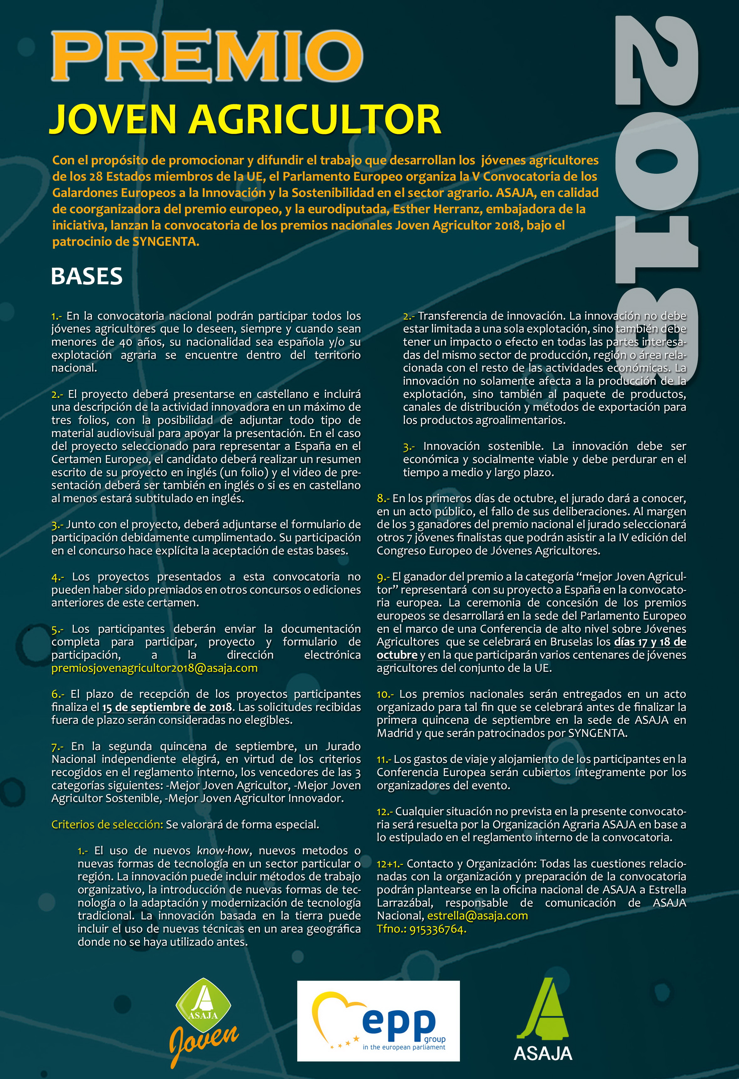 La Asociación Agraria Jóvenes Agricultores -ASAJA- convoca un año más su Certamen Nacional para elegir al mejor “Joven Agricultor”, con el propósito de promover y difundir los proyectos empresariales de los jóvenes agricultores y ganaderos españoles. En esta quinta edición el plazo de presentación de los proyectos permanecerá abierto hasta el 15 de septiembre inclusive, y en los primeros días de octubre se darán a conocer los nombres de los ganadores, así como la identidad del joven finalista que representará a España en los premios europeos.